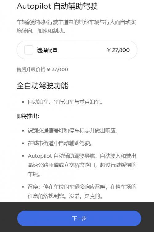 去年10月,由于外界批评该公司夸大了汽车的自动驾驶功能,特斯拉从其网站上删除了这一选项。现在,这一选项又重新出现在菜单上。
