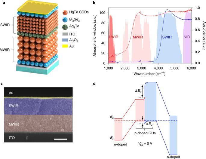 HgTe 胶状量子点双波段探测器的设计与工作原理。(图片来源:参考资料【2】)