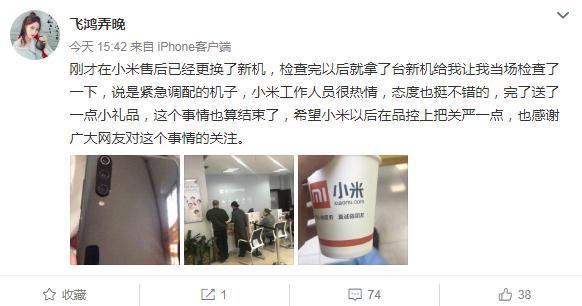 很快小米官方联系到了该用户,把没有闪光灯的小米9进行了回收,并让他去小米售后换了新机,送了一个保护套,他也比较满意小米的做法,他发微博称:“刚才在小米售后已经更换了新机,检查完以后就拿了台新机给我让我当场检查了一下,说是紧急调配的机子,小米工作人员很热情,态度也挺不错的,完了送了一点小礼品,这个事情也算结束了,希望小米以后在品控上把关严一点,也感谢广大网友对这个事情的关注。 ”