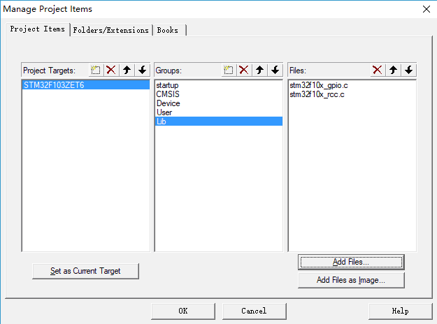2、在“项目条目管理”对话框中添加"Lib"组,并向组中添加两个库函数程序文件。