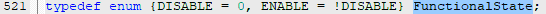 函数的第二个参数NewState取值为FunctionState类型,FunctionState类型是在"stm32f10x_rcc.c"文件中定义的一个枚举类型,有DISABLE和ENABLE两个取值,定义如下: