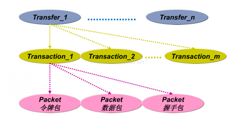 USB传输分为了3层:Packet、Transaction、Transfer,三者是由小到大,关系如下图: