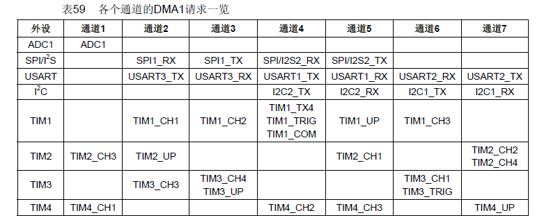 从外设(TIMx[x=1、2、3、4]、ADC1、SPI1、SPI/I2S2、I2Cx[x=1、2]和USARTx[x=1、2、3])产生的7个请求,通过逻辑或输入到DMA1控制器,这意味着同时只能有一个请求有效。各个通道的DMA1请求一览见下图: