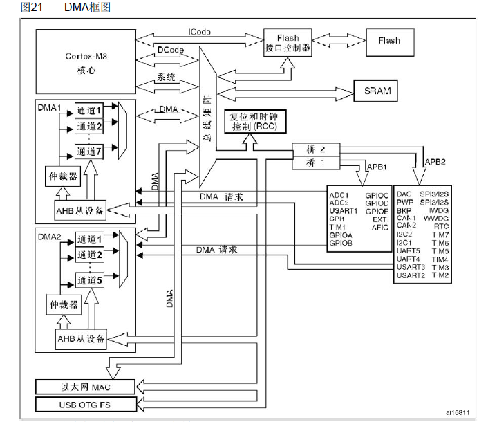DMA控制器和Cortex™-M3核心共享系统数据总线,执行直接存储器数据传输。当CPU和DMA同时访问相同的目标(RAM或外设)时,DMA请求会暂停CPU访问系统总线达若干个周期,总线仲裁器执行循环调度,以保证CPU至少可以得到一半的系统总线(存储器或外设)带宽。