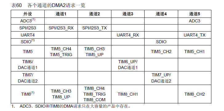 注意:在大容量产品中,DMA2通道4和DMA2通道5的中断被映射在同一个中断向量上。在互联型产品中,DMA2通道4和DMA2通道5的中断分别有独立的中断向量。所有其他的DMA通道都有自己的中断向量。