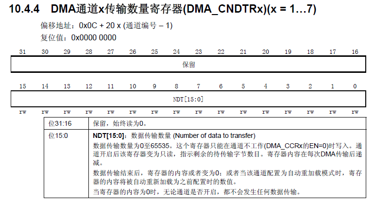 主要注意:该寄存器的值会随着传输的进行而减少,当该寄存器的值为0的时候,就代表着此次传输已经全部结束了。也就是说,当DMA通道开启传输了之后,该寄存器变成只读,指示的是数据传输数量中剩余待传输的字节数目。