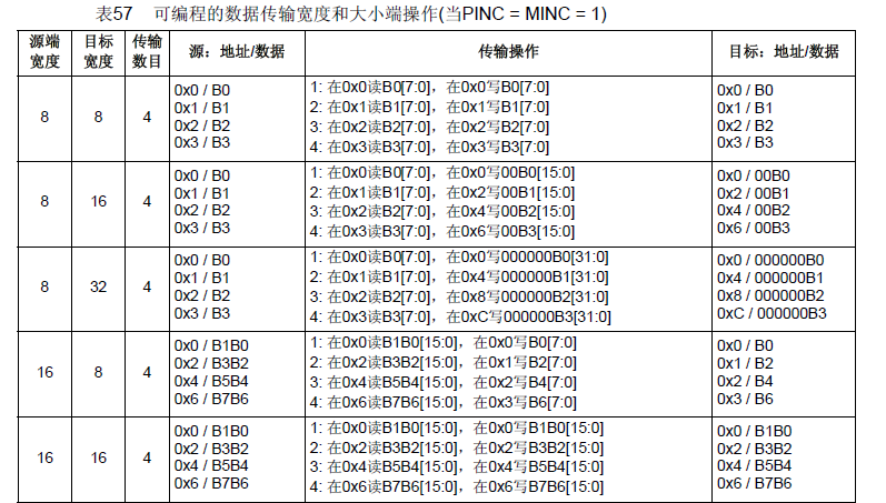 当PSIZE和MSIZE不相同时,DMA模块按照下图进行数据对齐。
