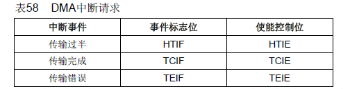 每个DMA通道都可以在DMA传输过半、传输完成和传输错误时产生中断。为应用的灵活性考虑,通过设置寄存器的不同位来打开这些中断。