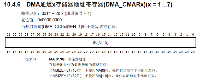 主要注意:当通道已经开启(被使能),此时DMA通道存储器地址寄存器就不能修改了。
