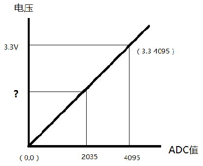 前面提到了,我们输入GND,读到的值是0,输入VDD,得到的值是4095,那么,当读到2035的时候,怎么求输入电压多少V吗?这个问题,归根接地,就到了数学XY坐标,已知两点坐标值(0,0)(3.3,4095),给出任意X坐标值,求Y值的问题了吧?简单不简单?