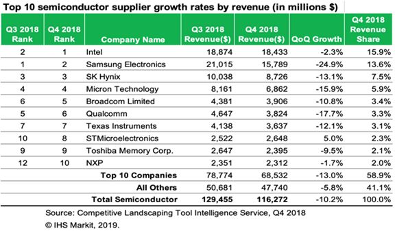 面向移动手机和企业服务器的半导体市场下滑,导致半导体制造商的市场份额排名出现调整。虽然过去五个季度三星在半导体销售方面一直处于领先地位,2018年第四季度英特尔反超了三星。第四季度,英特尔的半导体销售收入达到184亿美元,三星同期为158亿美元。但据IHS Markit数据显示,2018年第四季度,英特尔半导体销售额环比下降2.3%,而三星销售额环比则下降24.9%。