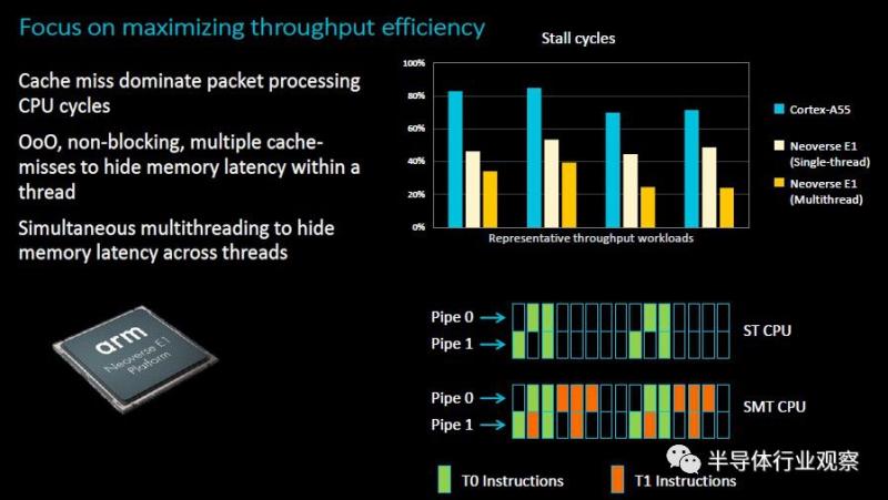 Neoverse N1和E1处理器都支持其流水线上的无序执行,但ARM首次在其ARMv8架构上用Helios E1芯片实现了SMT。直到最近,ARMv8体系结构的被授权方才将无序执行和SMT添加到他们创建的内核中,但是现在ARM正在做这项繁重的工作。Cortex-A57芯片针对的是平板电脑和具有适度计算需求的设备,具有乱序执行,后续的Cortex-A73和Cortex-A75处理器也是如此。但是这些都不像Helios E1那样有SMT。