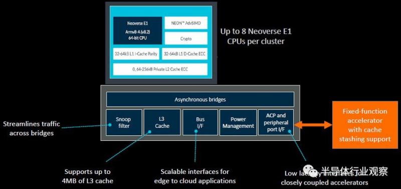 Helios的E1集群上最多可以有八个内核,绕内核的电路具有异步桥接,可连接高达4 MB的L3高速缓存,以及用于外围设备的各种总线接口,包括上述用于固定功能加速器的接口。你可以在E1芯片上有多个集群,cookie将它们切割到网格互连上。据推测,客户可以抓取内核并在E1内核之间进行网状互连,就像N1设计中所做的那样,而不是对它们进行集群,或者将集群拆分成chiplet,并使用CCIX端口将chiplet连接在一起,N1芯片也会是这样。(我们必须要看看ARM的合作伙伴如何利用所有这些好处。)