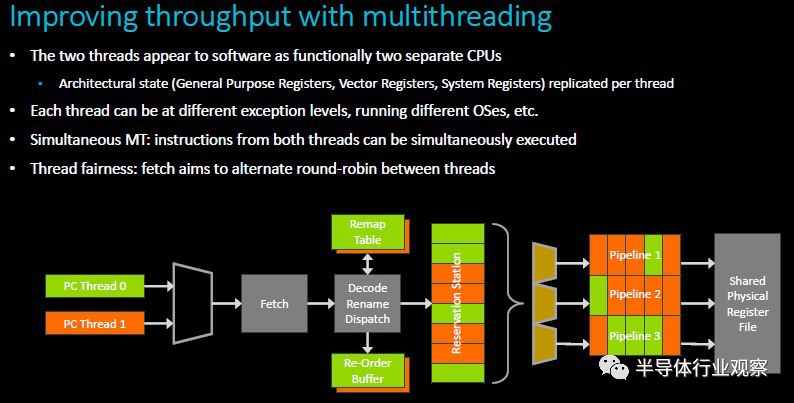 虽然Ares N1处理器将支持32位ARMv7和64位ARMv8指令,但为了节省Helios E1处理器的功耗和芯片面积并为SMT腾出空间,32位处理和内存寻址能力被放弃。以下是ARM为E1开发的SMT模型的细节: