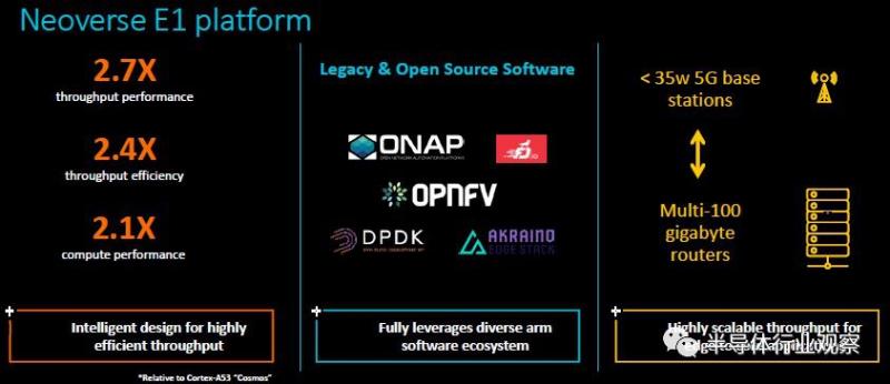 “E1将支持bot旧式软件和开源软件,因此它可以快速插入并执行OPNFV和ONAP,并支持DPDK。”Awad解释说。他使用开放式网络功能虚拟化平台(电信公司和服务提供商创建并使用的参考平台)和开放式网络自动化平台的字母组合,顾名思义,它是一个用于运行的编排和自动化框架,在其中运行网络功能,这些功能过去被硬化到无数供应商的非常昂贵的设备中。DPDK是Data Plane Development Kit的缩写,Data Plane Development Kit是英特尔创建的数据包处理引擎,已开源并交给Linux Foundation管理,现在支持X86、Power和ARM架构。“如果你考虑一下从边缘到内核的基础设施,就会看到有很多设备和软件都与之相关,我们推出的Neoverse E1平台可以支持该旧式软件,但可以过渡到此开源软件。”