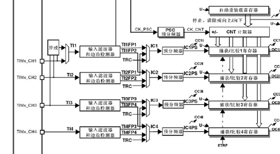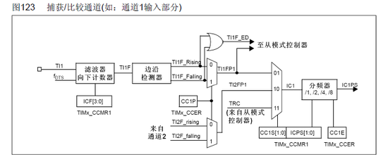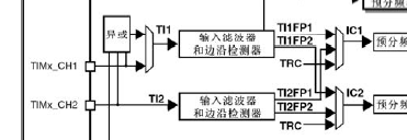 输入部分对相应的TIx输入信号采样,并产生一个滤波后的信号TIxF。然后,一个带极性选择的边缘检测器产生一个信号(TIxFPx),它可以作为从模式控制器的输入触发或者作为捕获控制。该信号通过预分频进入捕获寄存器(ICxPS)。