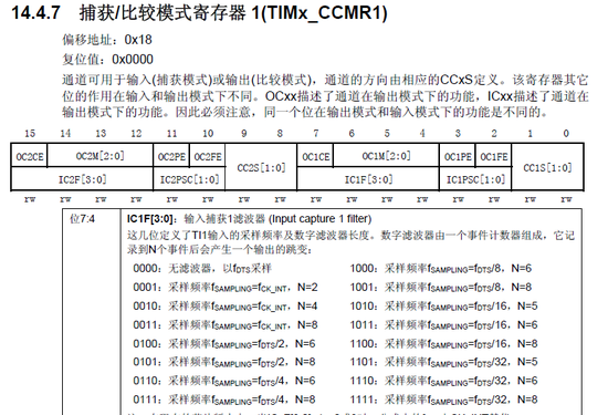 这里滤波器的作用是什么意思呢?数字滤波器由一个事件计数器组成,它记录到N个事件后会产生一个输出的跳变。也就是说连续N次采样,如果都是高电平,则说明这是一个有效的触发,就会进入输入捕捉中断(如果设置了的话)。这样就可以滤除那些高电平脉宽低于8个采样周期的脉冲信号,从而达到滤波的作用。