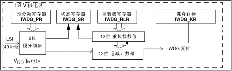 独立看门狗(IWDG)由专用的低速时钟(LSI)驱动(40kHz),即使主时钟发生故障它仍有效。独立看门狗适合应用于需要看门狗作为一个在主程序之外 能够完全独立工作,并且对时间精度要求低的场合。