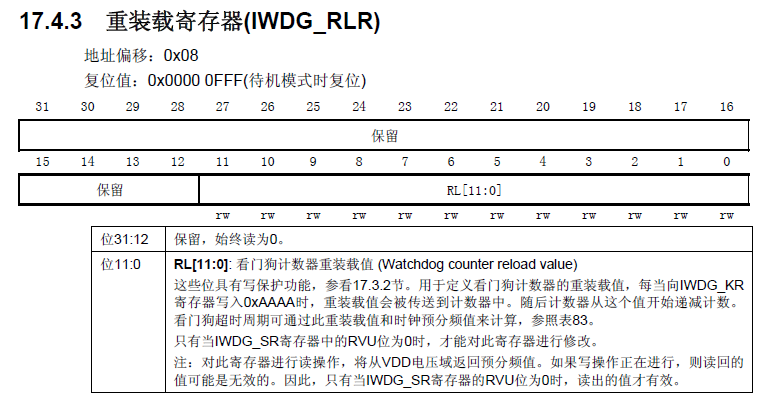作用:用于定义看门狗计数器的重装载值,每当向IWDG_KR寄存器写入0xAAAA时,重装载值会被传送到计数器中。随后计数器从这个值开始递减计数。