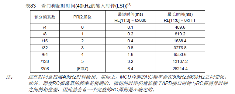 时钟频率LSI=40K, 一个看门狗时钟周期就是最短超时时间。最长超时时间= (IWDG_RLR寄存器最大值)X看门狗时钟周期。