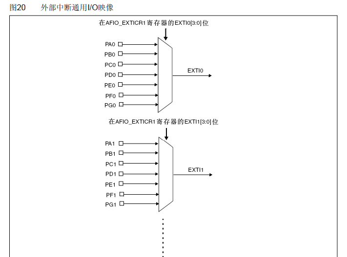 注意一下:同一个时间,只能有一个IO口映射到同一个中断线。也就是说,PA0和PB0不能同一时间映射到同一个中断线,而PA0、PA1则可以同时映射,因为它们不是在同一个中断线上。