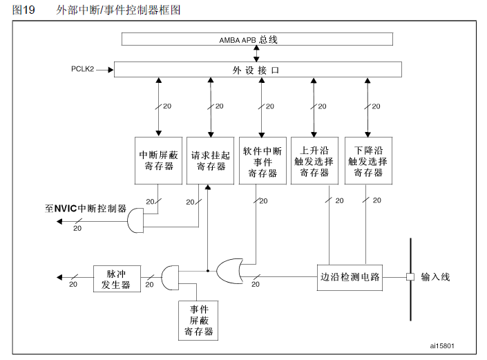 STM32的中断控制器支持19个外部中断、事件请求(也就是19条外部中断线):