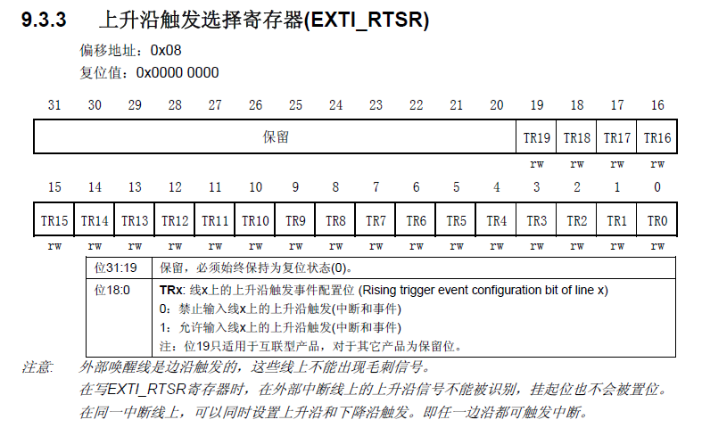 作用:每一位对应着一条中断线。清零表示关闭上升沿触发中断或事件;置1表示打开上升沿触发中断或事件。