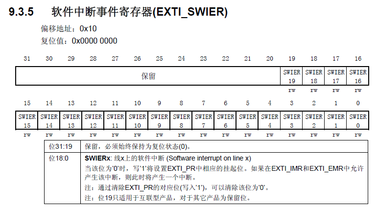作用:每一位对应着一条中断线。当EXTIx中断有效且SWIER=0时,向SWIER写1将触发中断请求。