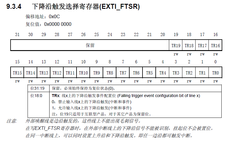 下降沿触发选择寄存器(EXTI_FTSR)