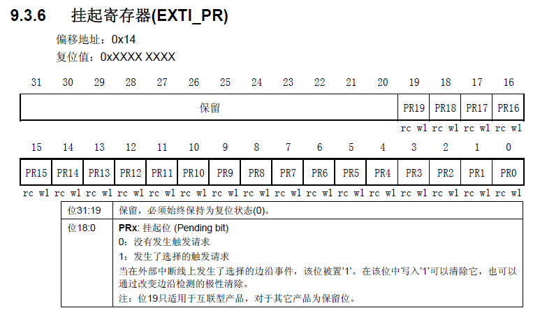 作用:每一位对应着一条中断线。如果第i个中断触发了,则PR位对应位自动置1;向PR位写入1清零该位,同时清除SWIER位。