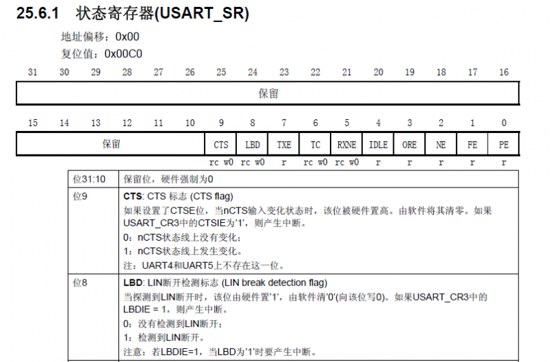 TC(发送完成):当该位被置1的时候,表示USART_DR内的数据已经被发送完成了。如果设置了这个位的中断,则会产生中断。该位也有两种清零方式:读USART_SR,写USART_DR;直接向该位写0。