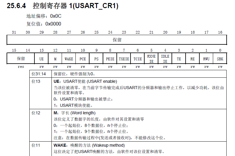 控制寄存器主要是设置USART使能、检验控制使能、校验选择(奇校验偶校验)、PE中断使能、发送缓冲区空中断使能、发送完成中断使能、接收缓冲区非空使能、发送使能、接受使能、字长等等。