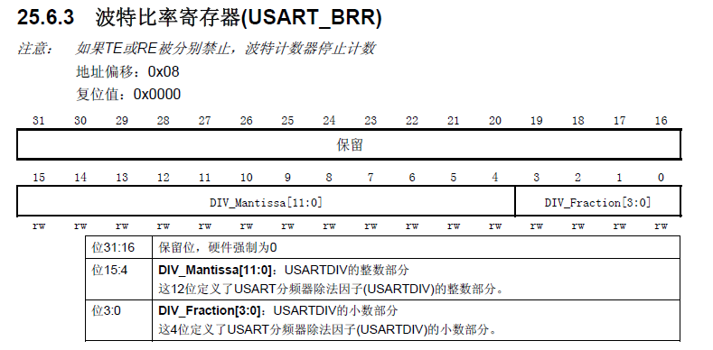 波特率寄存器包括定义了两个部分:DIV_Mantissa(整数部分)和DIV_Fraction(小数部分)。