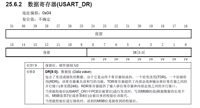 USART_DR实际是包含了两个寄存器,一个专门用于发送的TDR,一个专门用于接收的RDR。进行发送数据操作时,往USART_DR写入数据会自动存储在TDR内;当进行读取数据操作时,向USART_DR读取数据会自动提取RDR数据。