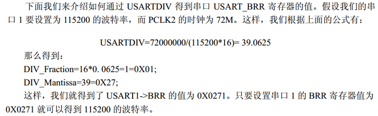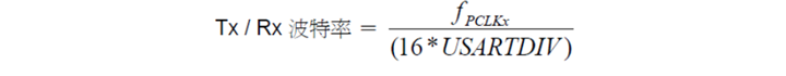 上面的公式中,fpclkx是给串口的时钟(PCLK1用于USART2、3、4、5,PCLK2用于USART1);USARTDIV是一个无符号定点数。我们只要得到USARTDIV的值,就可以计算出波特率。