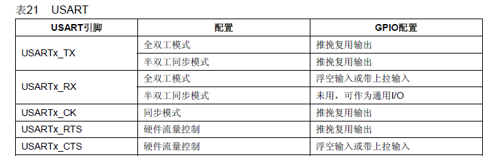 当使用USART的时候,GPIO需要引脚复用,下图介绍了USART的引脚设置: