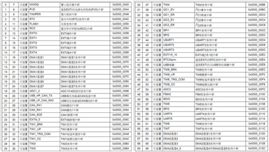 在中断向量表中从优先级7-66(中断号从0-59)代表着STM32F103的60个中断。优先级号越小,优先级越高。当表中的某处异常或中断被触发,程序计数器指针(PC)将跳转到该异常或中断的地址处执行,该地址处存放这一条跳转指令,跳转到该异常或中断的服务函数处执行相应的功能。因此,异常和中断向量表只能用汇编语言编写。