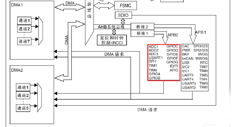 而APB2上面连接的是高速外设,包括UART1、SPI1、Timer1、ADC1、ADC2、ADC3、所有的普通I/O口(PA-PE)、第二功能I/O(AFIO)口等。