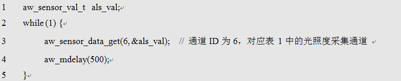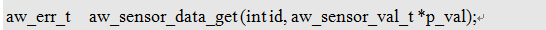 其中,id即为传感器通道ID号,p_val为存放对应ID的传感器数据。此处aw_sensor_val_t类型为一个结构体,只需知道它是一个保存传感器数据的变量即可。