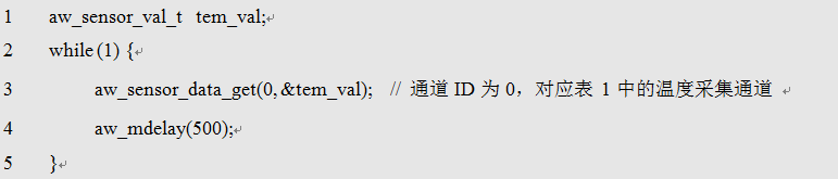基于此,获取系统中任意传感器通道的数据只需调用该接口即可,例如,每隔500ms获取一次温度采样数据的程序范例如下: