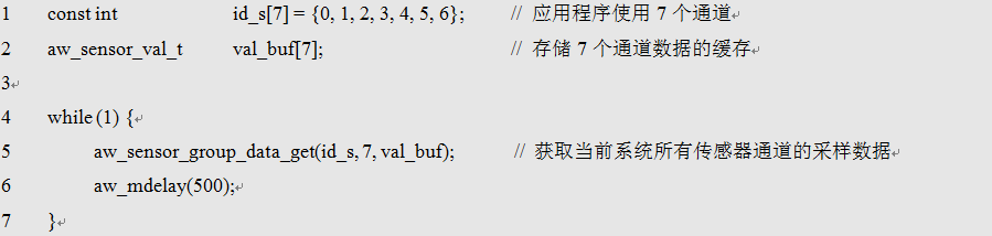 以此类推,只需要调用这一个相同的接口,便可以依次获取系统中所有传感器的数据。此时,或许有人会疑问,系统中那么多传感器,一个一个调用该接口,会不会显得繁琐?对于该问题,AWorks系统当然给出了答案,那就是提供同时获取多通道或者所有通道传感器数据的接口,该接口原型如下: