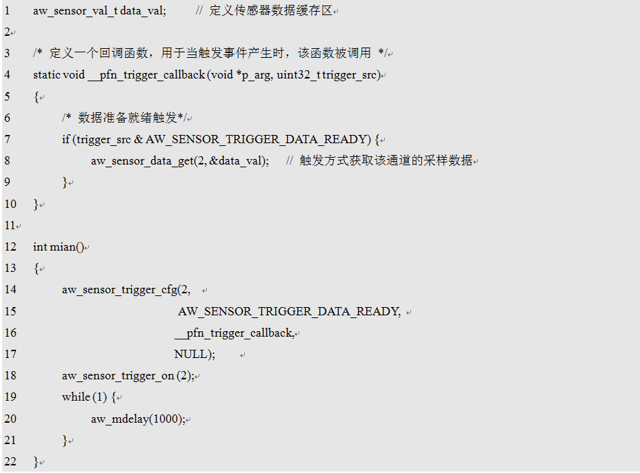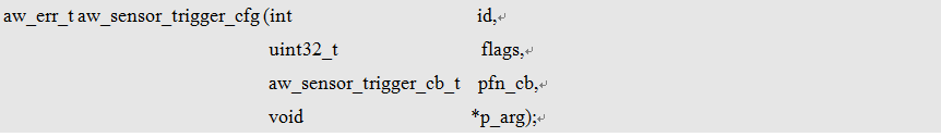 该函数接口只需传入id即可。注意,aw_sensor_trigger_on函数接口必须在aw_sensor_trigger_cfg接口之后调用,先后顺序不能颠倒。