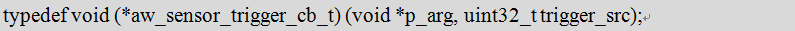 其中,id为传感器通道的编号,flags参数为配置的触发模式对应的宏(此处只以数据准备就绪触发举例,其所对应的宏在AWorks中定义为AW_SENSOR_TRIGGER_DATA_READY,直接传入即可),pfn_cb为触发回调函数,p_arg为用户触发回调函数参数。触发回调函数的类型为aw_sensor_trigger_cb_t,定义如下: