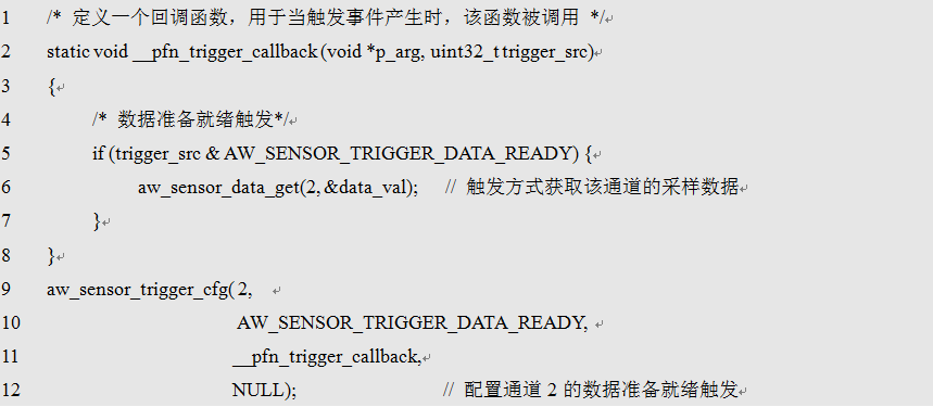 在AWorks中,要实现通过触发方式获取传感器通道数据,只需要两步操作即可,第一步是配置传感器通道的触发回调函数,第二步则是打开该通道的触发。