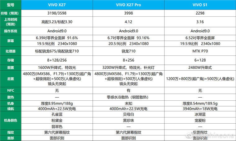 最后是vivo S1,目前该机已经成功入网,它用上了一块6.52英寸的零界全面屏,搭载一颗联发科P70八核心处理器,提供6+128GB的存储版本,主摄像头为1200万像素+800万像素+500万像素的组合,副摄像头为2480万像素,预装Android9.0的操作系统,内置3940毫安时电池,最大支持9V/2A的充电功率,后置指纹识别,机身有冰湖蓝、宠爱粉两种配色,预计将于3月16日上市,价格约为2298元。