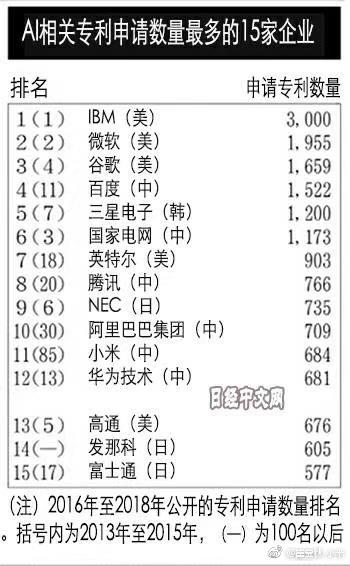 集微网消息(文/数码控),小米集团副总裁、小米技术委员会主席崔宝秋援引了日经中文网公布的全球15家AI申请专利的企业名单,他喜气洋洋的表示:“小米在AI上的投入巨大,专利数从去年的排名85升到了现在的11。”