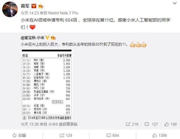小米在AI专利方面的取得了如此好的排名 ,也让小米CEO雷军深感欣慰,他称:“小米在AI领域申请专利 684项, 全球排在第11位。感谢小米人工智能部的同学们!”。