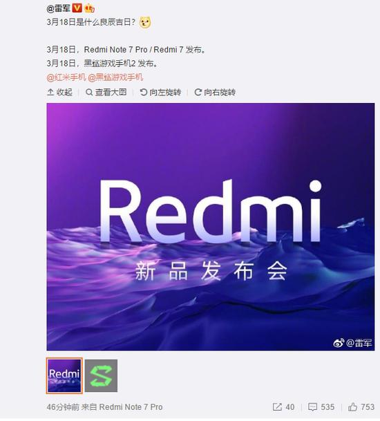 今天下午,雷军发微博预告:“3月18日是什么良辰吉日?3月18日,Redmi Note 7 Pro / Redmi 7 发布。3月18日,黑鲨游戏手机2 发布。”