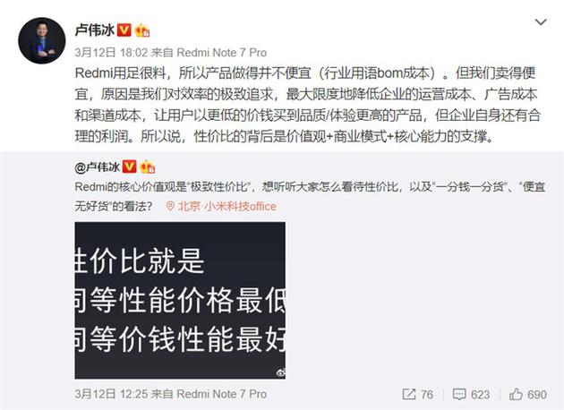 IT之家3月13日消息 昨日下午,小米集团副总裁、红米Redmi品牌总经理@卢伟冰 也谈到了对性价比的看法,并以Redmi举例说明。