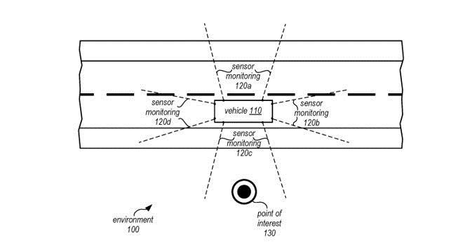 第二项专利申请名为“自动捕获兴趣点的图像数据”,主要涵盖了自动驾驶汽车如何确定环境中值得了解的区域,如其他道路使用者或路标。在确定了此类因素存在后,图像采集和处理系统可以将数据存储在本地,并与其他用于维护车辆运输的系统共享此类数据。